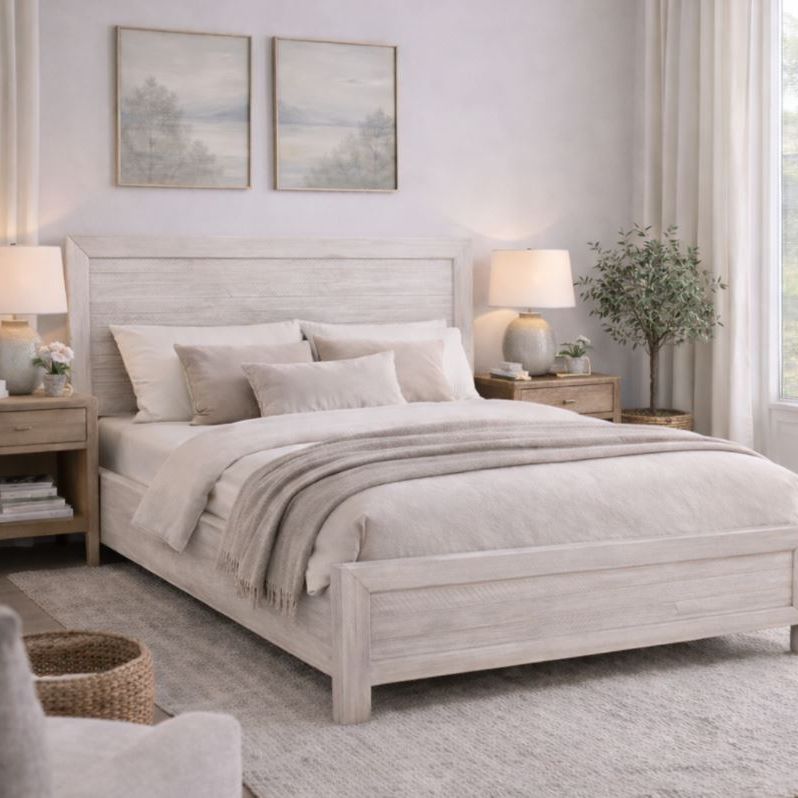 Create a calm and inviting bedroom with this beautifully crafted panel bed, designed with timeless simplicity and natural warmth. Made from light-toned wood with a softly textured finish, the bed showcases clean lines and wide panel detailing on both the headboard and footboard for a relaxed, sophisticated look. The sturdy frame and generous proportions provide lasting support, while the neutral wood finish complements a wide range of décor styles—from modern farmhouse to coastal and contemporary interiors. Thoughtfully designed to feel both substantial and airy, this bed serves as a versatile foundation for a serene and stylish sleep space. Available in King or Queen. Coordinating nightstands, dresser and mirror avaiilable. Material: Solid Acacia Wood Finish: Light Grey Washed Sealed Finish Queen- Width: 66 in Depth: 85 in Height: 59 in King-Width: 82 in Depth: 85 in Height: 59 in
