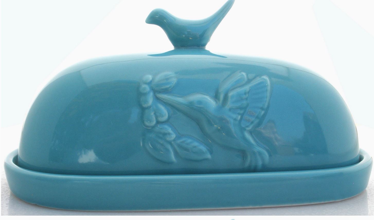 The Hummingbird Butter Dish is both attractive and practical, measuring 7 3/4″ x 4 1/8″ and easily holds 2 sticks of butter. The top Measures 7 1/8″ L x 3 1/2″ W x 3 1/2″ H. Refrigerator, Microwave, Oven and Dishwasher Safe. The quality porcelain and glazing allows you to enjoy your butter dish with a convenient and cool bird shaped handle. You will love this on your table or countertop, as well as in the fridge.