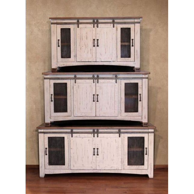 Featuring 100% solid pine. Black rubbed finish on base, natural pine on top and door frames. Multi-step nitrocellulose lacquer finish. Barn doors with functional rolling mechanism add a unique look. One fixed shelf behind all doors. Back panel includes wire-management grommets to organize cables of components. Side doors feature metal mesh on panels add rustic industrial appeal. 78-3/4 x 19 x 34-3/4. Delivery within 150 miles or store pick-up available. Please allow 6-8 weeks for delivery.
