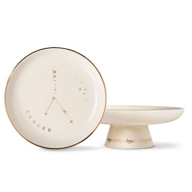 For your favorite Cancer! This zodiac trinket dish features Fringe original artwork with glossy glaze, metallic gold foil design, and a pedestal base. Unique personality traits wrap around the pedestal base to describe this one-of-a-kind star sign: empathetic, loyal, imaginative. Packaged in a decorative gift box.