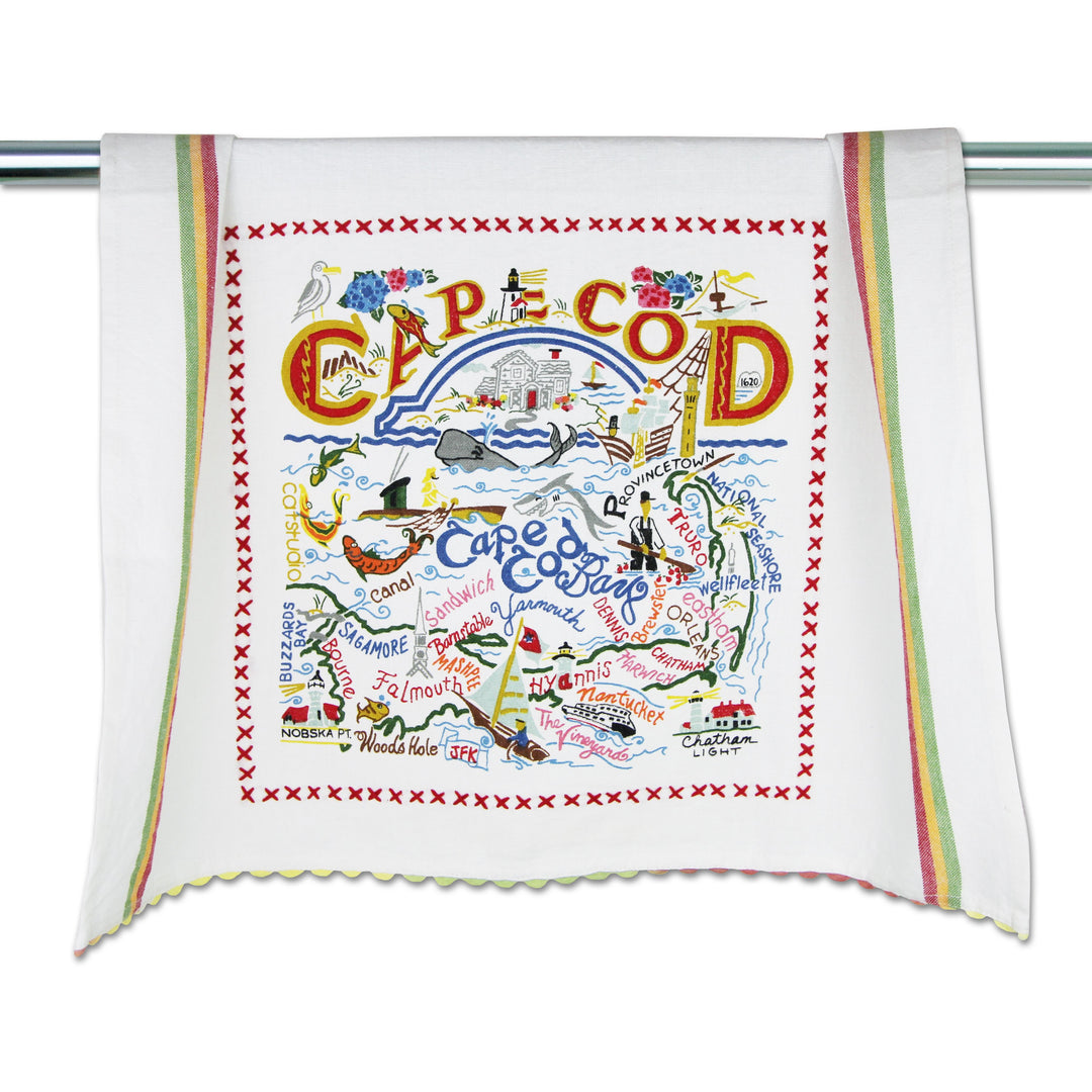Our original design is printed using the labor intensive hand-swipe silk-screen process with 12 colors (that's 12 screens used for each towel!). The design is framed with a hand-embroidered border on a 100% hand-loomed cotton towel generously sized at 20x29 inches. Three cheery woven stripes run down both sides and hand-dyed rick-rack at the top and bottom add a charming vintage touch. All this delightfully presented in a fab organdy re-usable pouch ready for gifting!