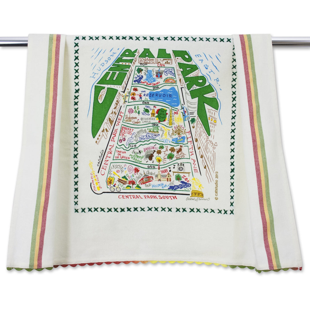 Our original design is printed using the labor intensive hand-swipe silk-screen process with 12 colors (that's 12 screens used for each towel!). The design is framed with a hand-embroidered border on a 100% hand-loomed cotton towel generously sized at 20x29 inches. Three cheery woven stripes run down both sides and hand-dyed rick-rack at the top and bottom add a charming vintage touch. All this delightfully presented in a fab organdy re-usable pouch ready for gifting!