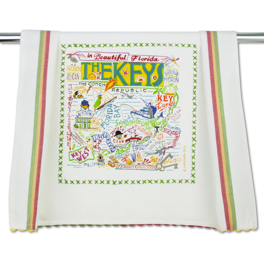 Our original design is printed using the labor intensive hand-swipe silk-screen process with 12 colors (that's 12 screens used for each towel!). The design is framed with a hand-embroidered border on a 100% hand-loomed cotton towel generously sized at 20x29 inches. Three cheery woven stripes run down both sides and hand-dyed rick-rack at the top and bottom add a charming vintage touch. All this delightfully presented in a fab organdy re-usable pouch ready for gifting!