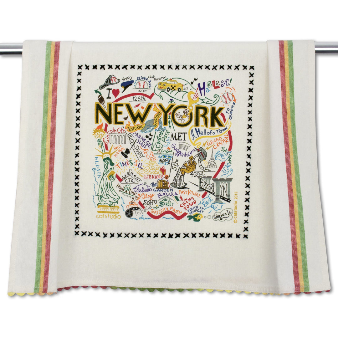 Our original design is printed using the labor intensive hand-swipe silk-screen process with 12 colors (that's 12 screens used for each towel!). The design is framed with a hand-embroidered border on a 100% hand-loomed cotton towel generously sized at 20x29 inches. Three cheery woven stripes run down both sides and hand-dyed rick-rack at the top and bottom add a charming vintage touch. All this delightfully presented in a fab organdy re-usable pouch ready for gifting!