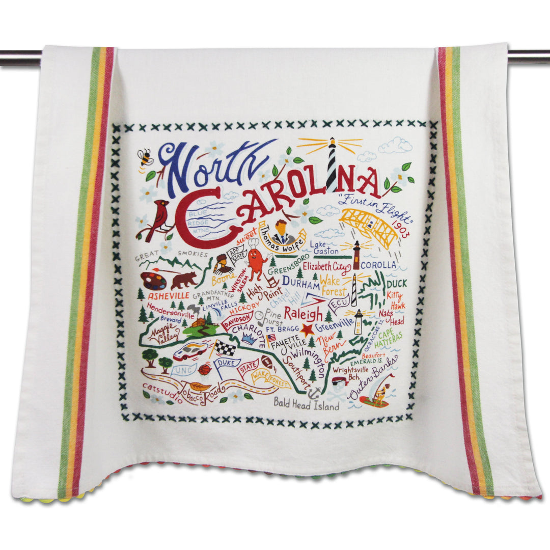 Our original design is printed using the labor intensive hand-swipe silk-screen process with 12 colors (that's 12 screens used for each towel!). The design is framed with a hand-embroidered border on a 100% hand-loomed cotton towel generously sized at 20x29 inches. Three cheery woven stripes run down both sides and hand-dyed rick-rack at the top and bottom add a charming vintage touch. All this delightfully presented in a fab organdy re-usable pouch ready for gifting!