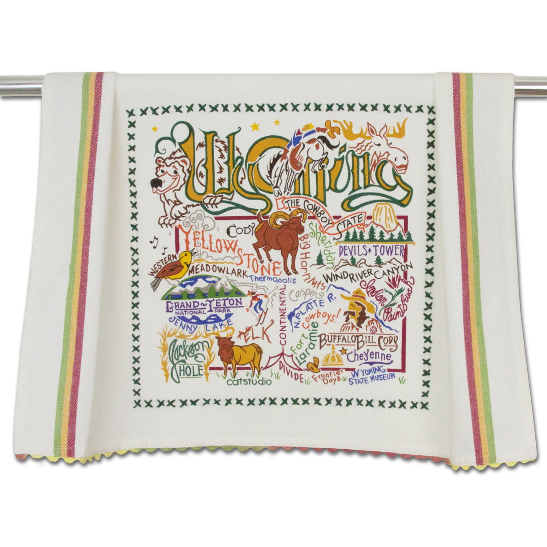 Our original design is printed using the labor intensive hand-swipe silk-screen process with 12 colors (that's 12 screens used for each towel!). The design is framed with a hand-embroidered border on a 100% hand-loomed cotton towel generously sized at 20x29 inches. Three cheery woven stripes run down both sides and hand-dyed rick-rack at the top and bottom add a charming vintage touch. All this delightfully presented in a fab organdy re-usable pouch ready for gifting!