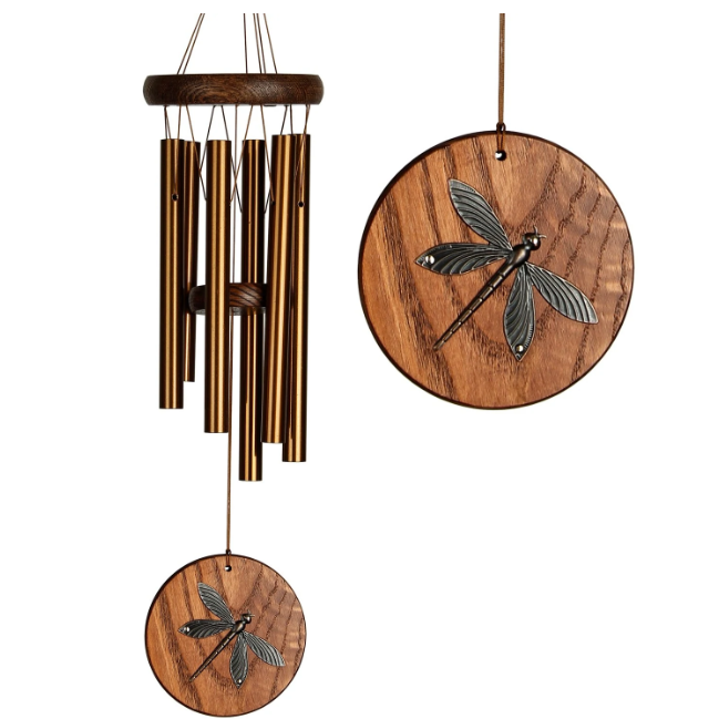 An antiqued copper-plated dragonfly hovers below this charming chime.