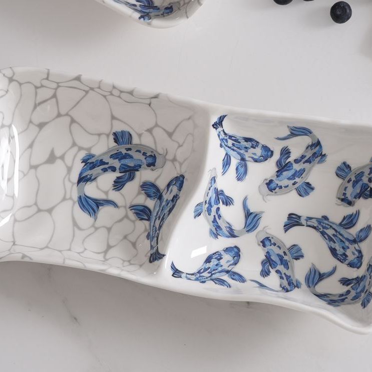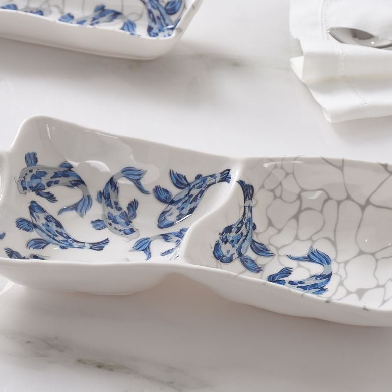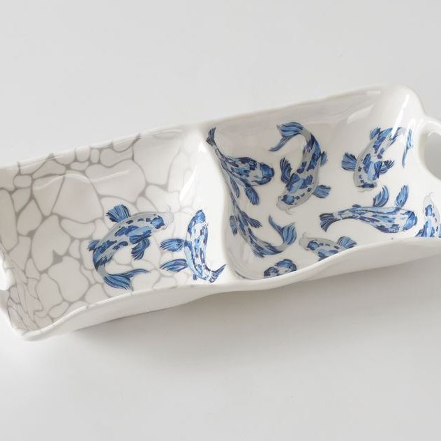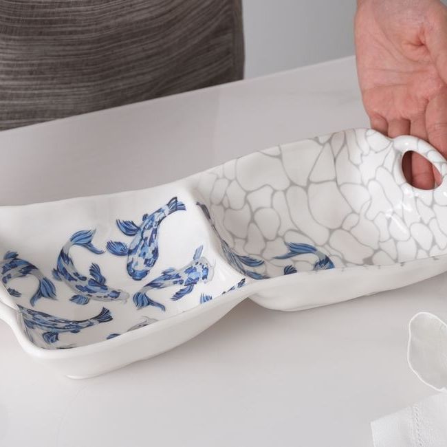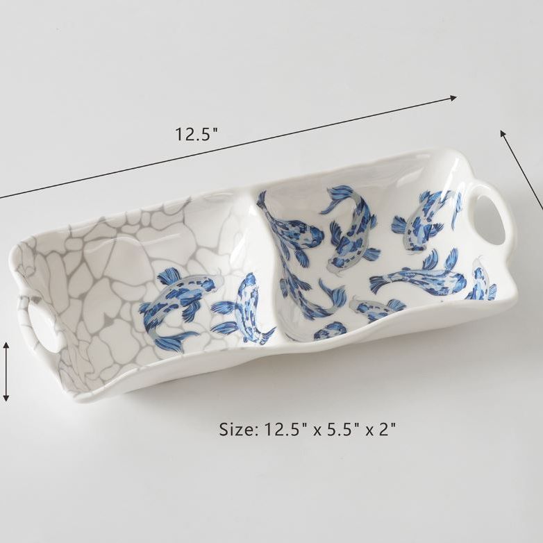 2 Section Server in our Koi Collection. Great for serving your favorite pairs! Think chips and dip, hummus and veggies or apples and peanut butter. The striking imagery of the koi combined with rich blue hues invoke a sense of harmony and serenity on this durable melamine piece. Great for your indoor and outdoor activities. Food safe, freezer safe, dishwasher safe. Easy Care. Size: 12.5 x 5.5 x 2 in.
