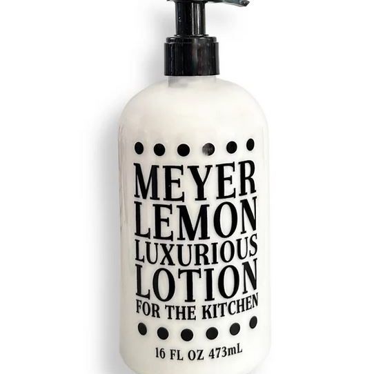 MEYER LEMON lotion, enriched with shea butter, cocoa butter, virgin olive oil and orange, grapefruit & lemon extracts. 16oz. Bottle topped with pump.