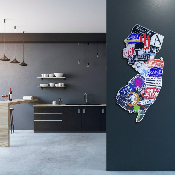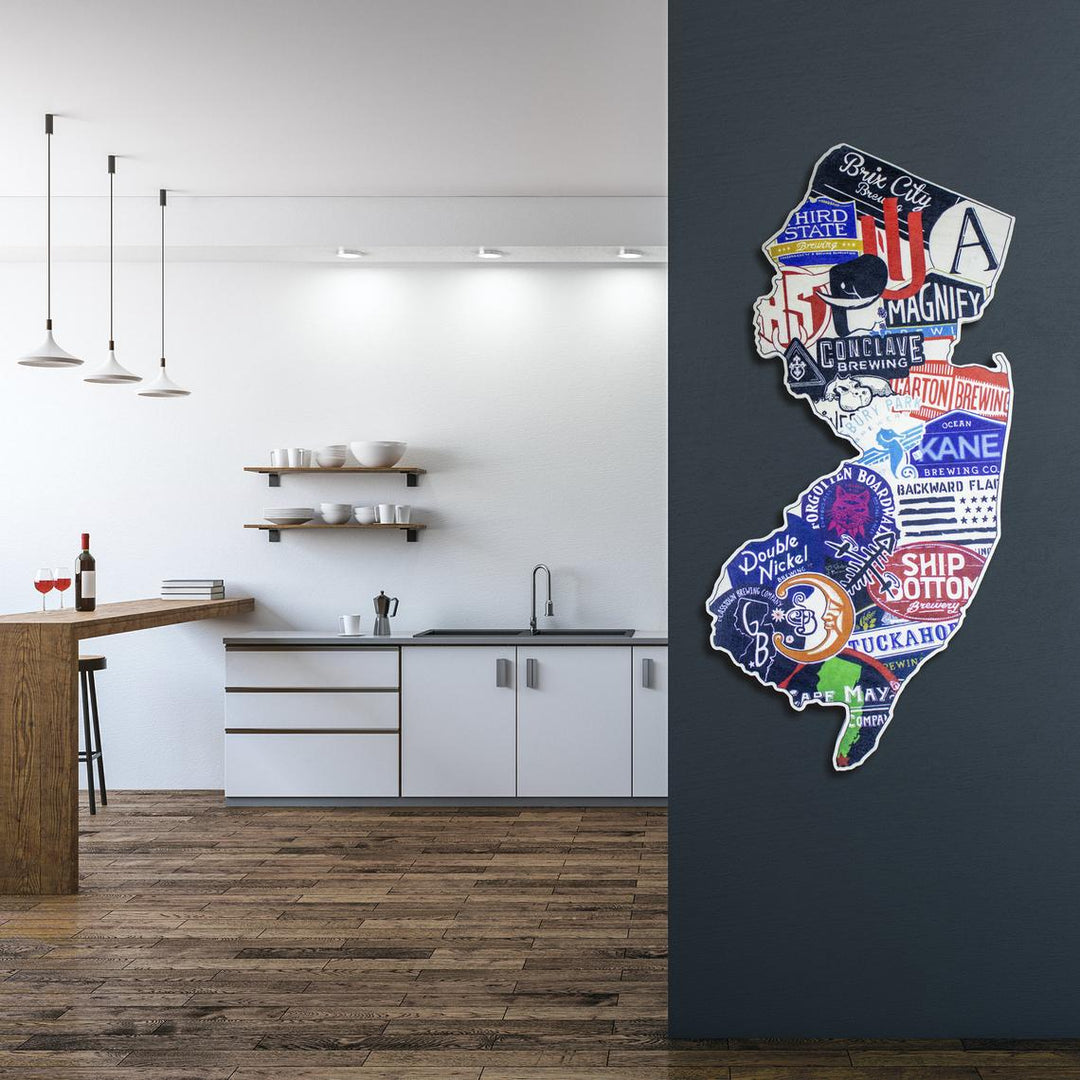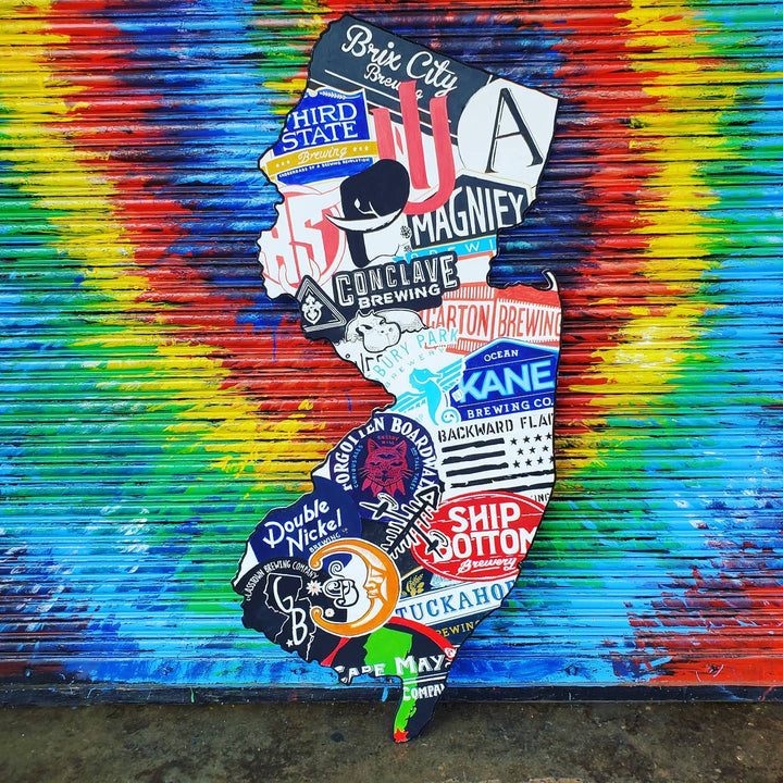 Custom designed and originally hand painted aluminum beer map of New Jersey Art, that any libationist would appreciate, featuring some of the Garden State's most notable microbreweries. The "BIER GARTEN STATE"! Available as 3D cut outs on either: 3mm dibond brushed aluminum or 1/2" Baltic birch wood. Wall hanging comes with a set of standoffs (to raise it off the wall), screws and drywall anchors. Measures 39" x 17"