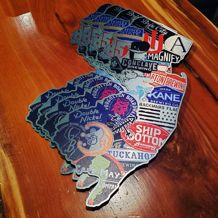 Custom designed and originally hand painted aluminum beer map of New Jersey Art, that any libationist would appreciate, featuring some of the Garden State's most notable microbreweries. The "BIER GARTEN STATE"! Available as 3D cut outs on either: 3mm dibond brushed aluminum or 1/2" Baltic birch wood. Wall hanging comes with a set of standoffs (to raise it off the wall), screws and drywall anchors. Measures 20" x 9"