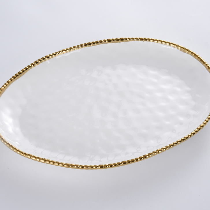 Large Oval Platter in Golden Salerno. Perfect for tempting guests with your delicious main course or hearty sides. Use for dessert to display an assortment of treats and sweets! Generously sized at over 18” in length. Gleaming white porcelain with lustrous gold beads in titanium. Food safe. Food safe, tarnish free, dishwasher safe, oven safe to 500°. Tarnish and stain-free. Easy Care.