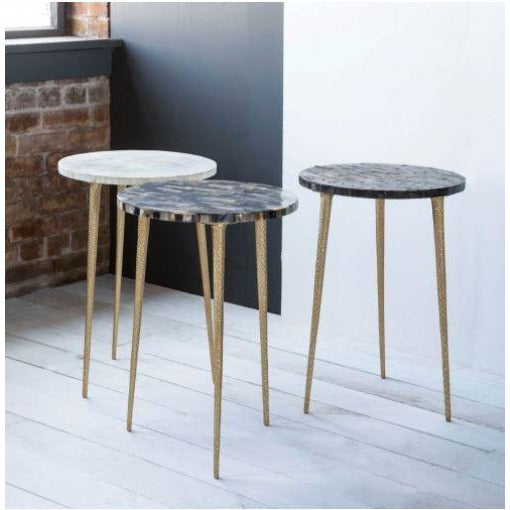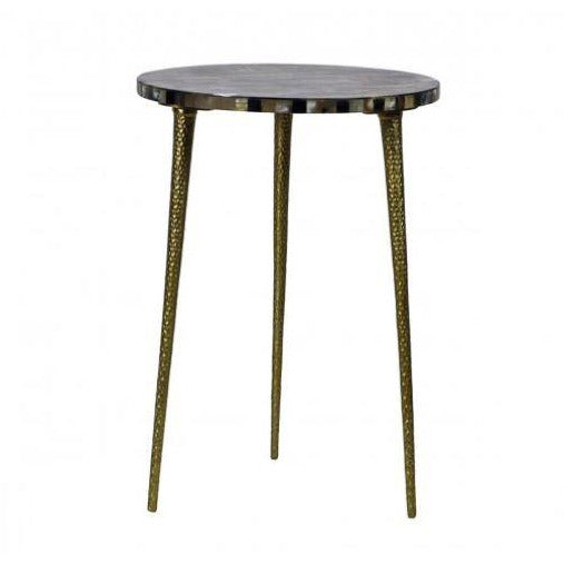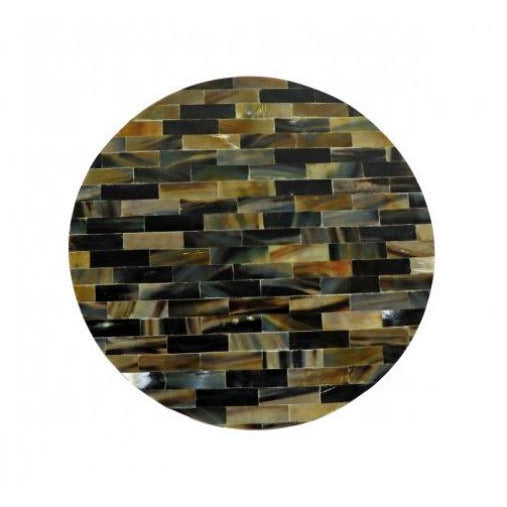 Nature's most artful elements are hand-crafted into striking designs for our textured horn and bone table tops on hammered iron legs with brass finish. Assembly required. 15 3/4'' dia x 22''. Delivery within 150 miles or store pick-up available.
