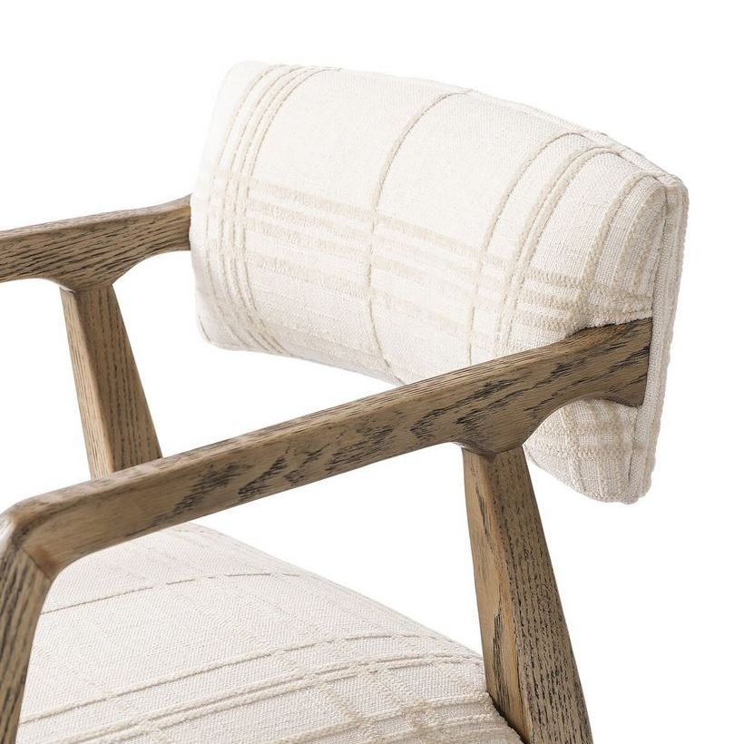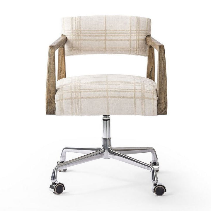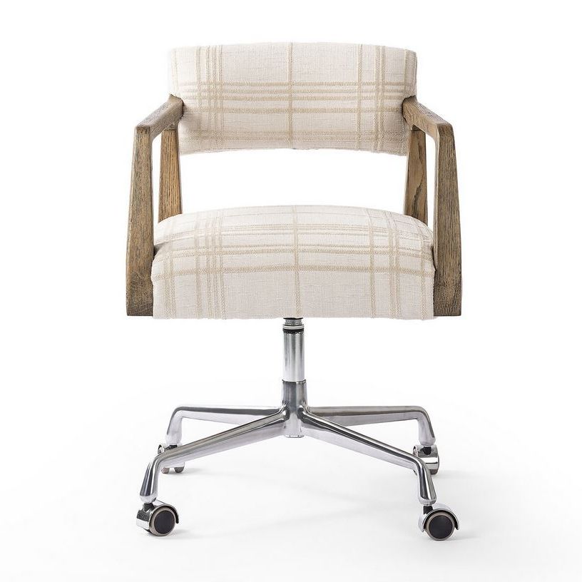 An angular, distressed nettlewood frame holds a deep seat and striking, low-slung back. Covered in a traditional ivory fabric with a classic box pattern. Metal casters make for ease in the workplace. Height not adjustable. Overall Dimensions: 21.75"w X 23.50"d X 30.75"h. Available for store pick-up or local delivery only (within 150 miles).